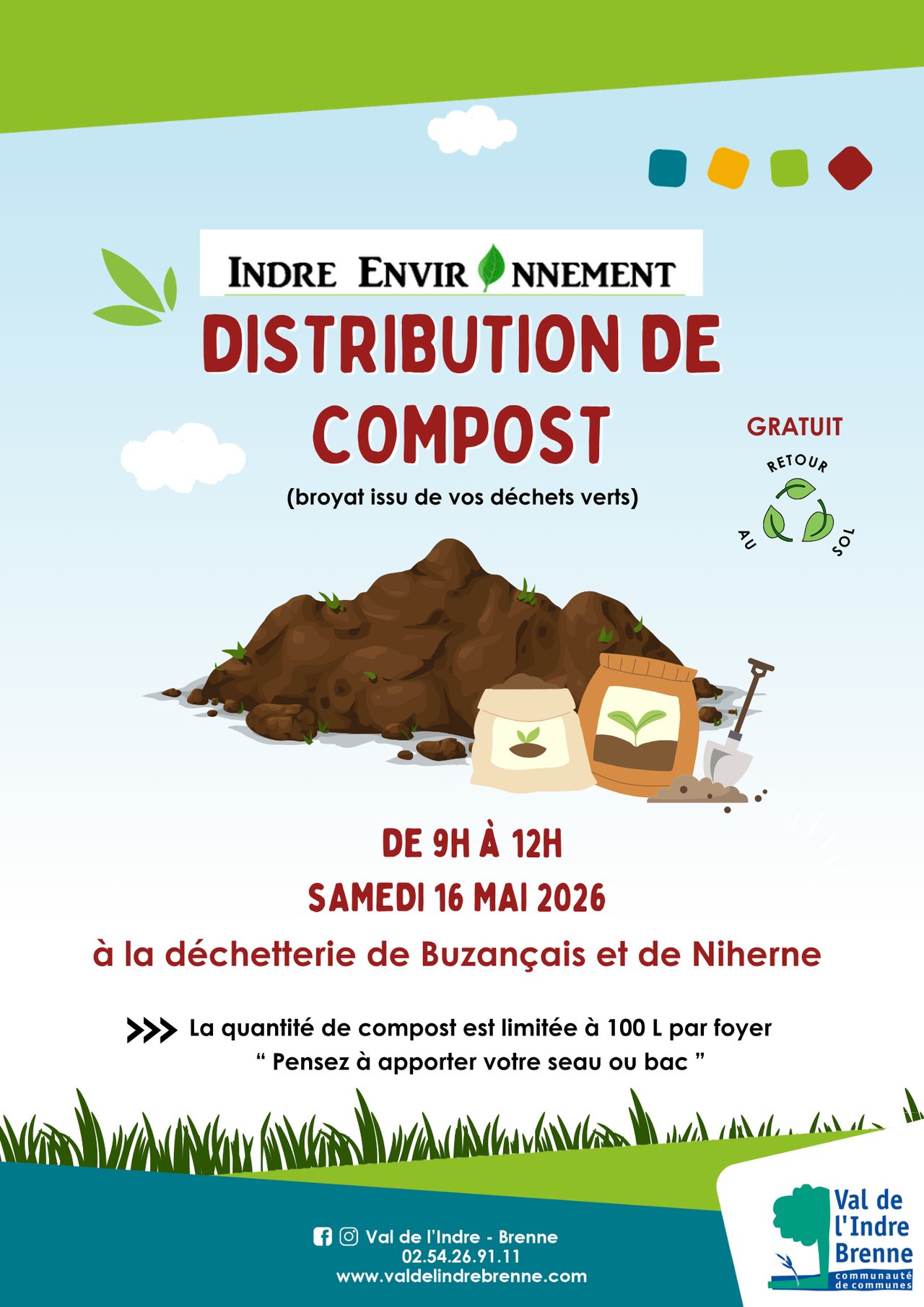 Une distribution de compost, organisée par Indre environnement aura lieu dans nos deux déchetteries communautaires du Buzançais et de Niherne le samedi 16 mai 2026 de 9h à 12h.