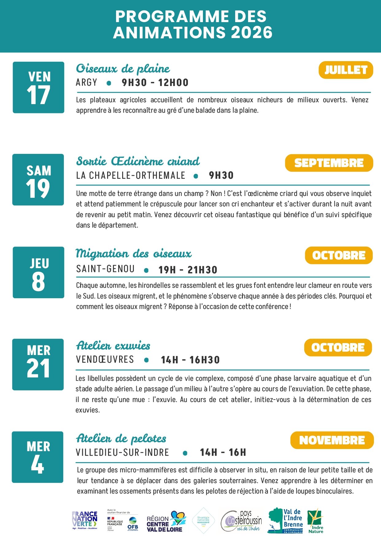 La réservation est obligatoire, vous pouvez contacter le 02 54 22 60 20 ou envoyer un mail à animation@indrenature.net