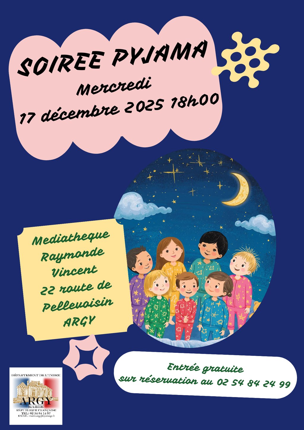 Venez participer à notre soirée Pyjama, le mercredi 17 Décembre, à la médiathèque Raymonde Vincent, 22 Route de Pellevoisin à Argy !