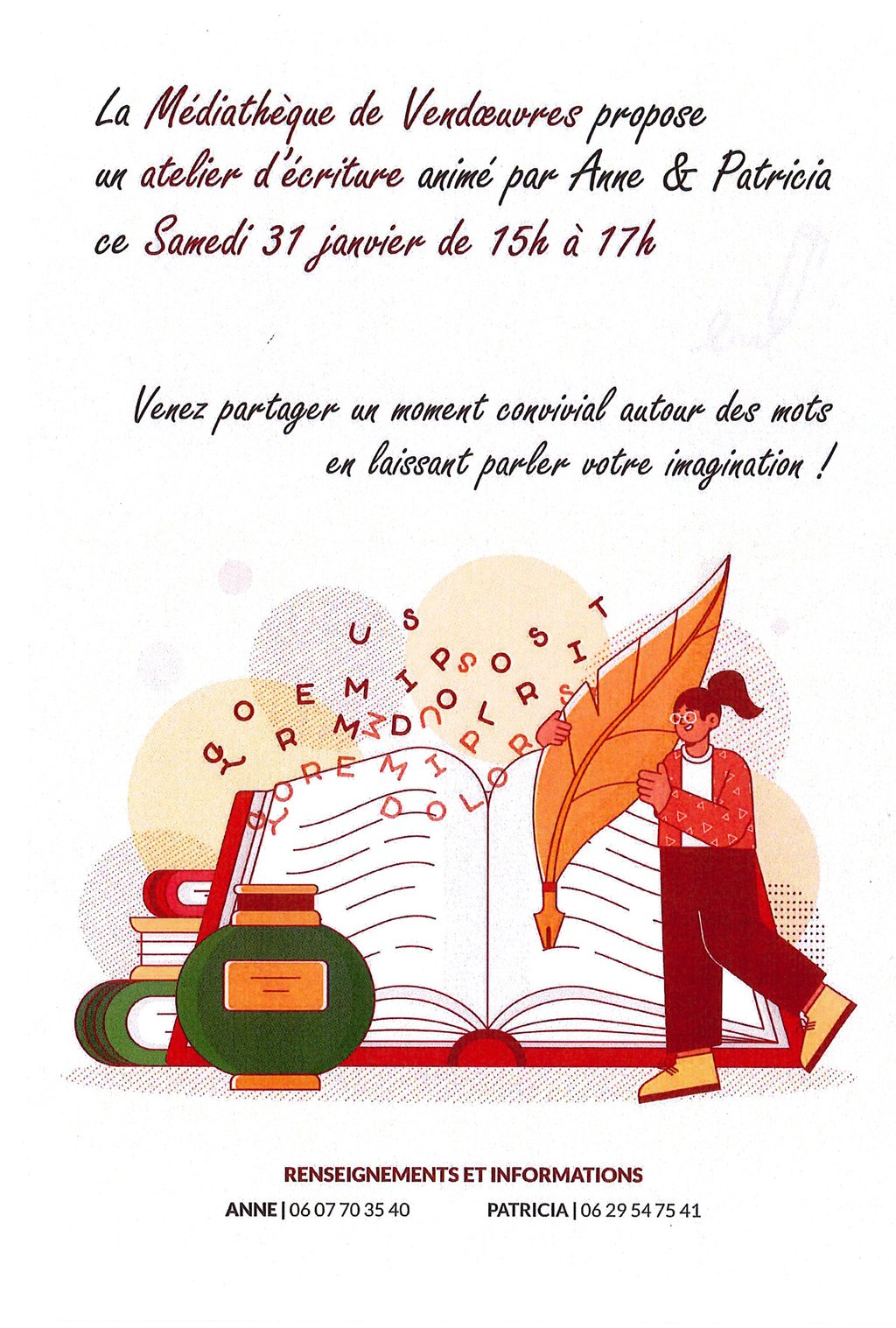 Atelier d'écriture animé par Anne & Patricia le Samedi 31 Janvier de 15h à 17h