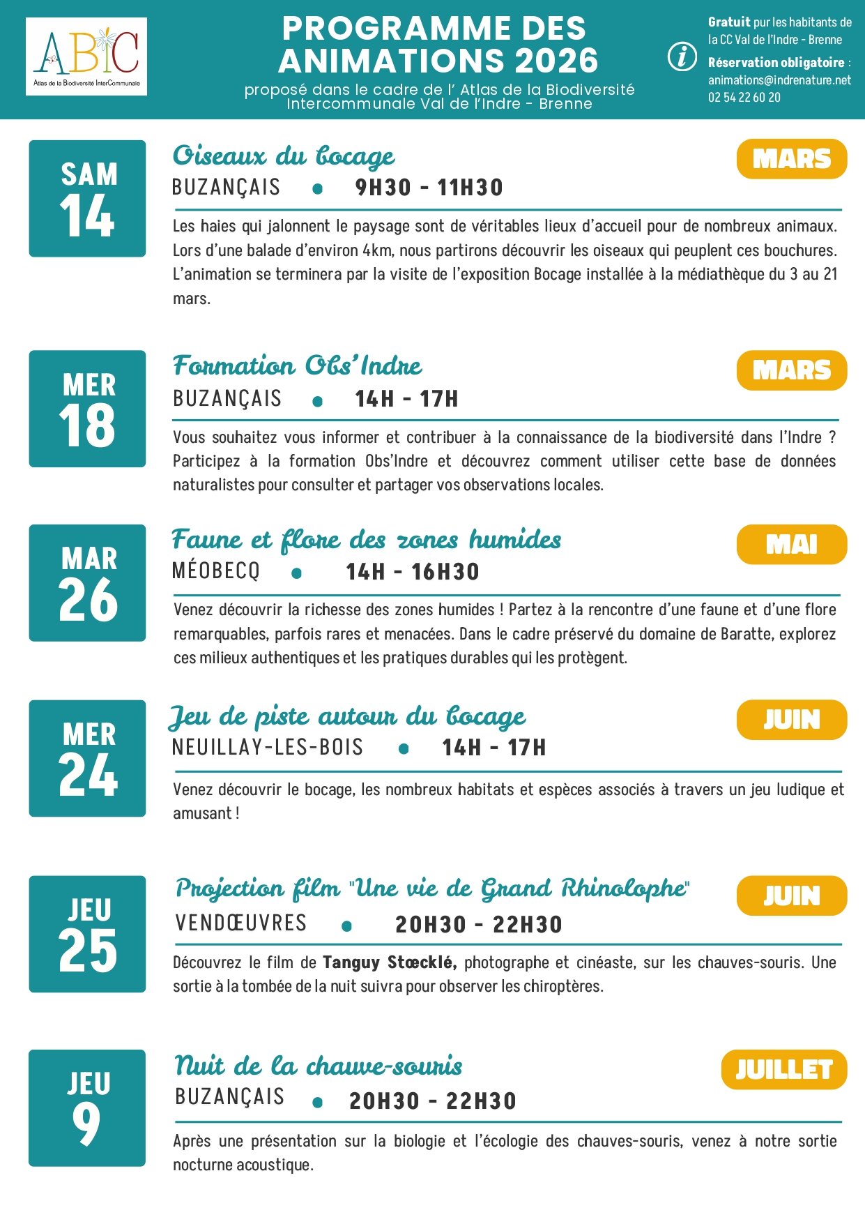 L'inscription s'effectue directement auprès de l'association Indre Nature - 02 54 22 60 20 - animations@indrenature.net.