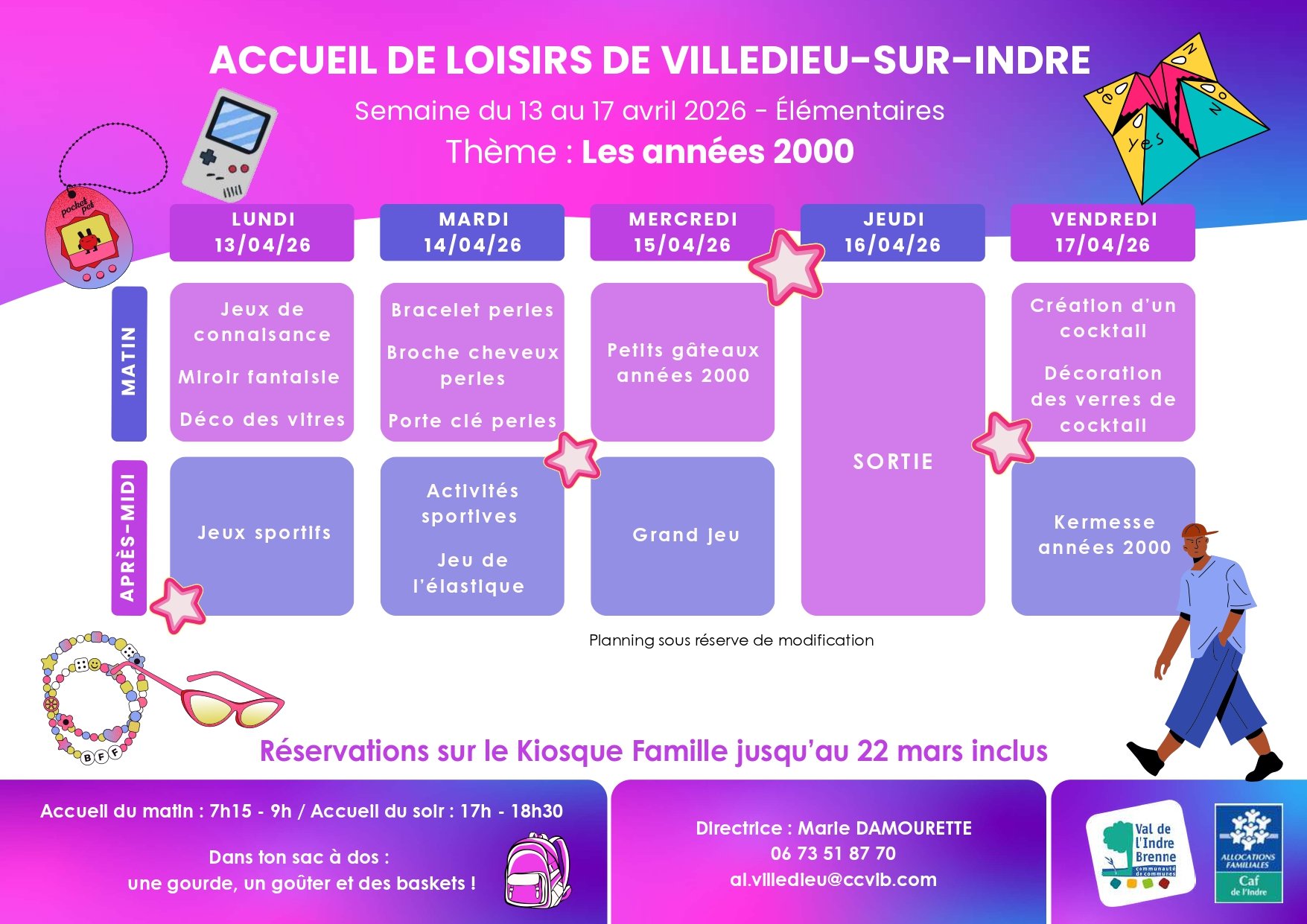 Les inscriptions sont terminées. Si vous avez des besoins, il est toujours possible d'en faire la demande via le kiosque famille sur l'onglet "Contacez le service Enfance - Jeunesse". La demande ne pourra être acceptée qu'en fonction des effectifs présents et des places disponibles. La réservation sera soumise à majoration.