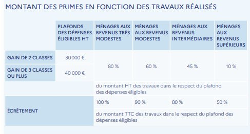 MaPrimeRénov’ vise à encourager les ménages à entreprendre des rénovations ambitieuses. Elle est accessible quelle que soit la classe énergétique du logement et quels que soient les revenus du ménage. Elle est accessible aux propriétaires occupants et aux propriétaires bailleurs. Ce dispositif inclut un accompagnement personnalisé par Mon Accompagnateur Rénov’.