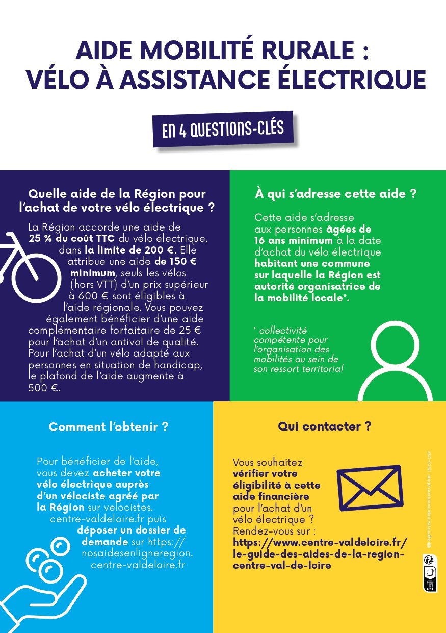 Afin de favoriser la pratique du vélo au quotidien en zone peu dense, la Région Centre Val de Loire a mis en place depuis le 1er juillet 2023 une aide à l’achat d’un vélo à assistance électrique destiné à un usage utilitaire (aller au travail, faire ses courses, transporter ses enfants à l’école, etc.) à hauteur de 25% du prix d’acquisition auprès d’un vélociste agréé par la région, dans une limite de 200€ (min 150€).