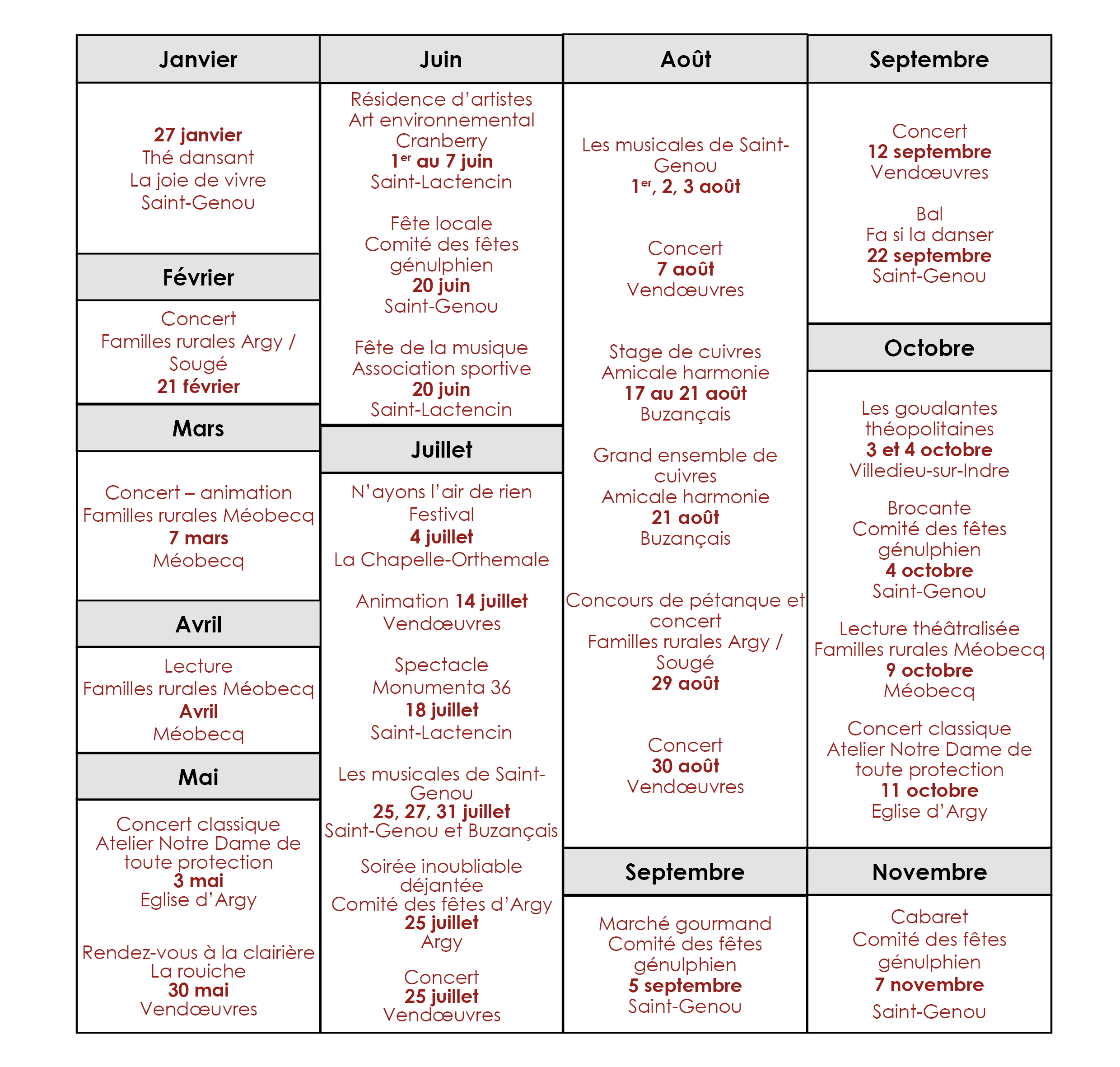 Dans le cadre du PACT, crée par la Région Centre Val de Loire, certaines associations organisent des manifestations en partenariat avec la Communauté de communes.